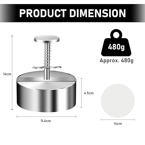 【Pratica Pressa per Hamburger】Con la nostra pressa per hamburger in acciaio inox, potrete facilmente creare hamburger professionali con un impatto sorprendente! Con un diametro di 11,4 cm, otterrai la dimensione perfetta del panino. Grazie alla costruzione a pressione verso il basso con molla della pressa per hamburger, l'uso sarà estremamente semplice!