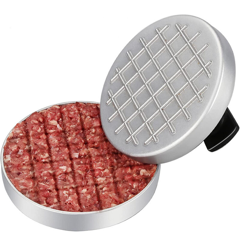 MATERIALE ALIMENTARE - La pressa per hamburger è realizzata in lega di alluminio anodizzato duro con una solida impugnatura in bachelite, eccezionale rivestimento antiaderente per prevenire ruggine e corrosione. CUCINA VERSATILE PER UTENSILI -- - Mostra ottime prestazioni per la preparazione di carne macinata ma anche per hamburger vegani, polpette di salsiccia, torte di granchio, ecc. Lo stampo con il manico può anche essere una tostatrice durante la cottura al forno o sulla griglia. FACILE E VELOCE - Gli stampi di forma rotonda con scanalatura daranno un aspetto perfetto e regoleranno lo spessore perfetto dell'hamburger in secondi. È molto facile da pulire con detergente e acqua su una superficie liscia.