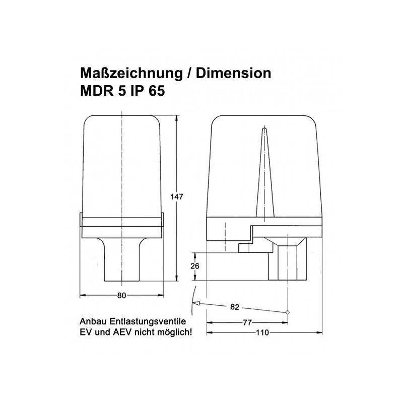 Pressostato Condor per compressori tipo MDR 5 Versione speciale con classe di protezione IP 65 secondo EN 60947 Applicazioni: ad esempio alberi di pompe Dati tecnici: Campo di pressione PAus 2 - 11 bar Pressione massima Pressione di taglio 45 bar Connessione Flangia da 1/2 Capacità di rottura 5,5 kW Temperatura media Aria da -5 °C a +80 °C Acqua +80 °C Grado di protezione IP 65 Versione Corrente trifase Resistenza ai fluidi: Acetilene, Benzina, Butano, Diesel, Gas naturale, Petrolio, Glicole etilenico, Glicerolo, Olio combustibile, Urina, Anidride carbonica, Acido carbonico, Aria, Oli minerali, Olio vegetale, Propano, Olio di silicio, Azoto, Oli sintetici, Acqua, Acqua distillata, Idrogeno, Acqua di mare, Vapore acqueo