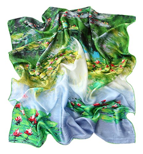 Prettystern Donna Raso Seta Foulard Scialli Sciarpa Monet stampa artistica 90cm Quadrato Ninfee verde e bianco P067
