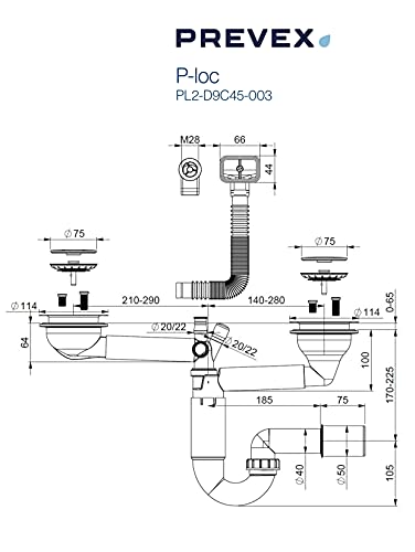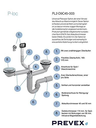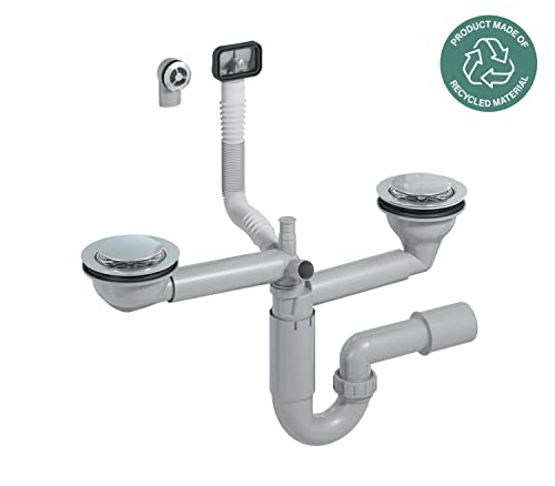 PREVEX P-loc - Kit completo universale per sifone da cucina a 1,5 o 2 vasche da cucina, con colino, copertura magnetica e 2 traboccanti | realizzato in plastica riciclata e acciaio inossidabile