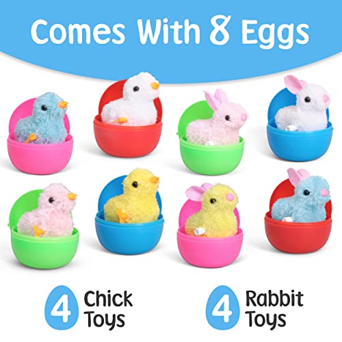 Il set include: 8 uova di Pasqua grandi già riempite. Riempite con adorabili conigli e pulcini colorati a molla.