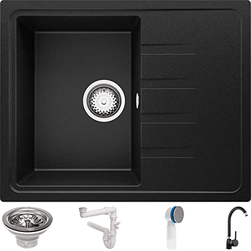 Primagran - Lavello antibatterico in granito, 62 x 50 cm, set di scarico e rubinetto da cucina, per sottolavelli da 45 cm, in 5 colori, lavello da incasso "Miland Compact", Nero