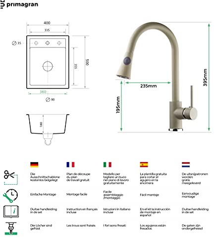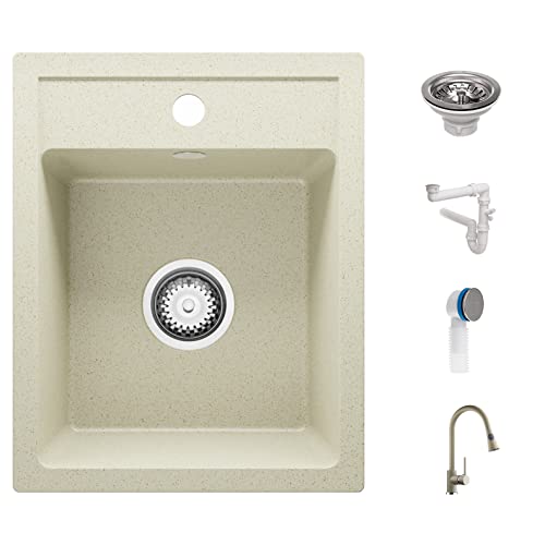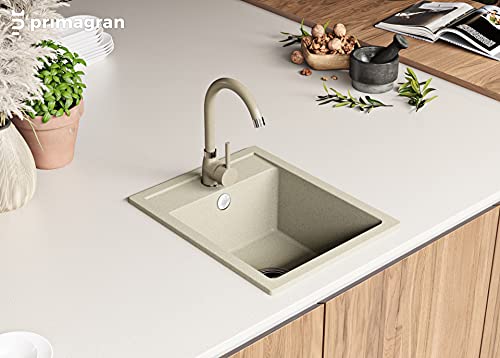 Primagran - Lavello da cucina in granito, 40 x 50 cm, con rubinetto e sifone classico, per sottolavelli da 40 cm, in 5 colori, con diversi tipi di miscelatori, lavello da incasso, colore beige