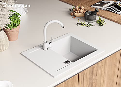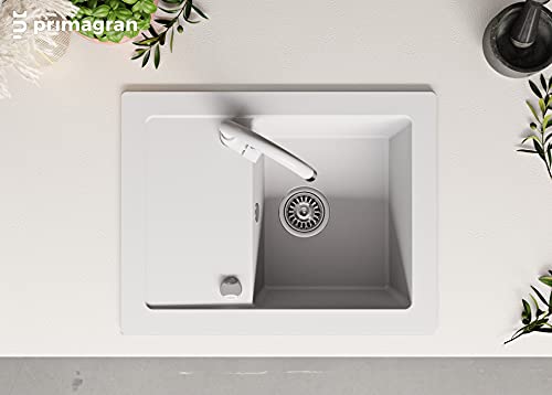 Primagran - Lavello da cucina in granito, 64 x 49 cm, con sifone classico, per sottolavelli da 45 cm, in 5 colori, varianti con sifone e antibatterici, lavello da incasso, colore bianco