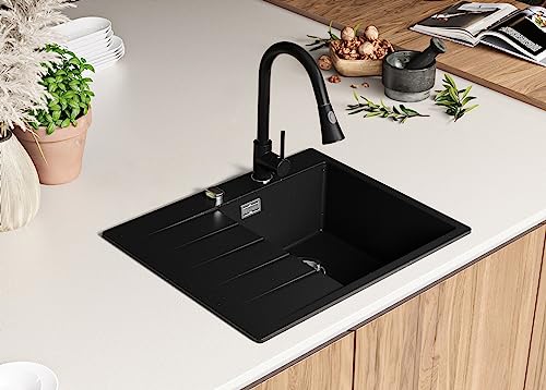 PRIMAGRAN Lavello in Granito 62 x 50 cm, Lavandino Cucina 1 vasca + Rubinetto + Sifone Classico, Lavabo Cucina da Incasso Sydney 620, Nero Metallic