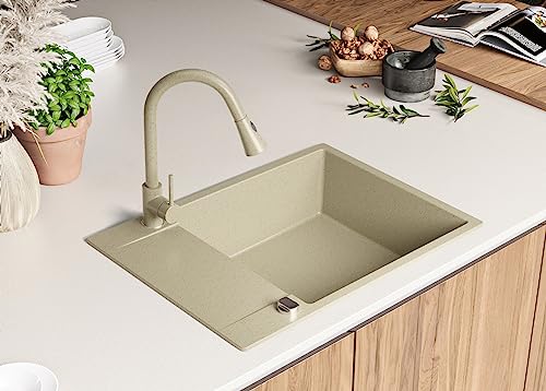 PRIMAGRAN Lavello in Granito 70 x 50 cm, Lavandino Cucina 1 vasca + Rubinetto + Sifone Classico, Lavabo Cucina da Incasso San Francisco 700, Beige