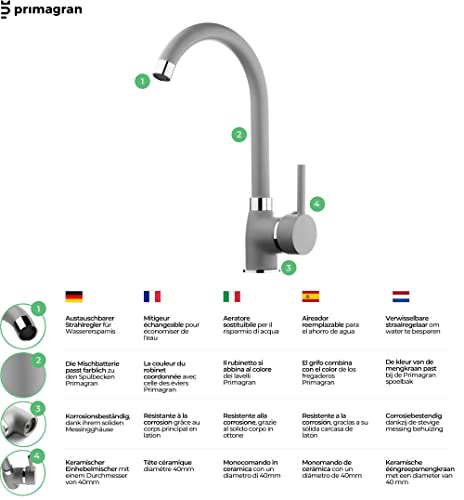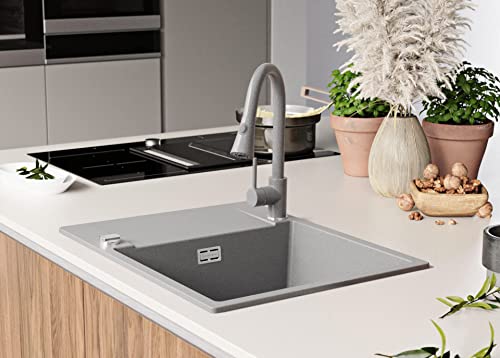 PRIMAGRAN Lavello in Granito 62 x 50 cm, Lavandino Cucina 1 vasca + Rubinetto + Sifone Classico, scolapiatti avvolgibile, Lavabo Cucina da Incasso San Francisco 620 Level, Grigio