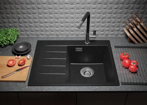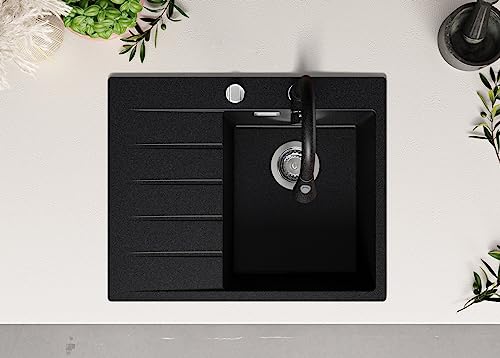 PRIMAGRAN Lavello in Granito 62 x 50 cm, Lavandino Cucina 1 vasca + Sifone Classico, Lavabo Cucina da Incasso Sydney 620, Grafite