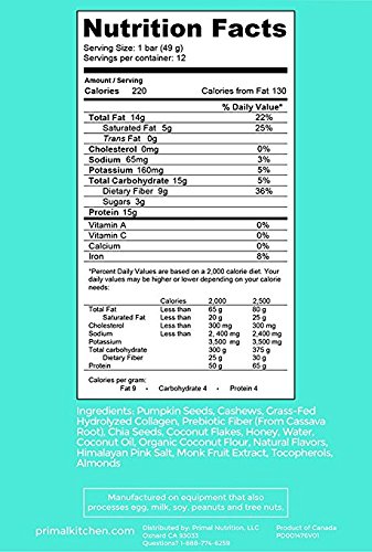 Primal Kitchen - Barretta senza glutine a base di anacardio collagene di cocco Primal Kitchen ad erba - 12 barrette