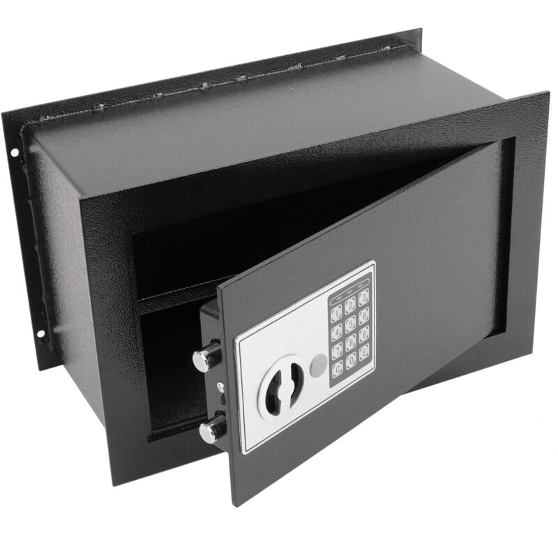 Descrizione cassaforte per riporre denaro, documenti e oggetti di valore, realizzata in acciaio ad alta resistenza, spessore e qualità, ideale per riporre e proteggere il denaro in negozi, uffici, alberghi, appartamenti, casa, uffici,, può anche essere utilizzata come portagioie o per riporre piccoli oggetti personali di valore, Sistema di chiusura tramite codice elettronico, Modello progettato per essere incassato a parete, poiché dispone di Cornice metallico anteriore e posteriore, B specifiche/B UL li cassaforte per riporre denaro, documenti e oggetti di valore, ideale per riporre e proteggere il denaro in negozi, uffici, alberghi, appartamenti, casa, uffici,, li realizzata in acciaio ad alta resistenza, spessore e qualità, verniciata in colore nero, Modello progettato per essere incassato a parete, in quanto dispone di cornice metallico frontale e posteriore, li sistema di chiusura mediante combinazione elettronica digitale, dispone di due bulloni all' interno (diametro di ogni