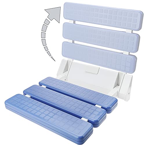 Sedile per doccia pieghevole, realizzato in alluminio estruso bianco e plastica ABS blu. Ideale per anziani, nonni, disabili o persone con mobilità ridotta.