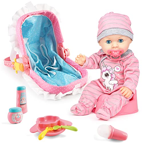 【Giocattoli per bambole】 Il nostro set di bambole sarebbe il regalo perfetto per le tue bambine. Questo set di bambole include una bambola con tratti del viso realistici. L'occhio della bambola si aprirà anche quando è seduto e si chiuderà quando sarà sdraiato. Gli accessori includono x1 biberon, x2 bottiglie di lozione per bambini, x1 vasino, x1 ciuccio, x1 cucchiaio, x1 forchetta, x1 biberon e x1 marsupio per il tuo bambino per trasportare la bambola.