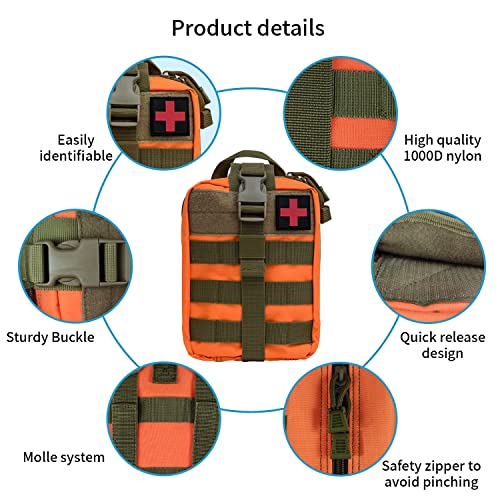 【Kit Medico di Pronto Soccorso Ultra Resistente】Kit medico militare dimensioni sono 20 * 15 * 8 cm,Questo prodotto non solo ha una grande capacità, ma è anche dotato di un sistema di molle, che può organizzare in modo ordinato gli articoli di primo soccorso e i gadget di sopravvivenza necessari durante il campeggio all'aperto. Fornisce una protezione più affidabile durante l'avventura.