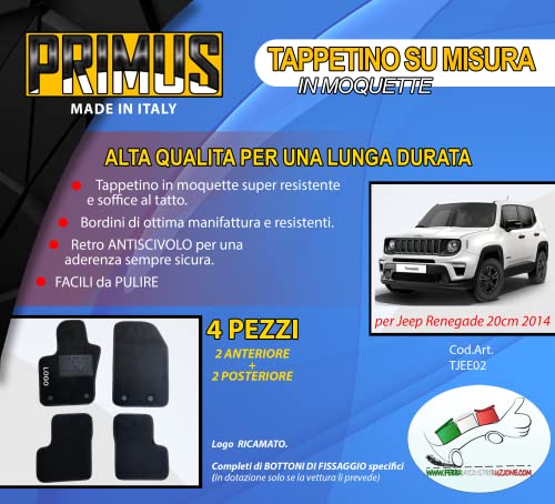 PRIMUS - Set Tappetini in Moquette su misura | Compatibili Jeep Renegade 2014 20cm interasse | Logo Ricamato, Nero