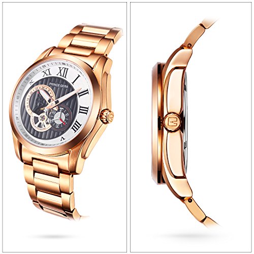 Prince Gera - Orologio da uomo meccanico automatico in oro rosa con quadrante doppio quadrante nero Lancetta delle ore luminosa