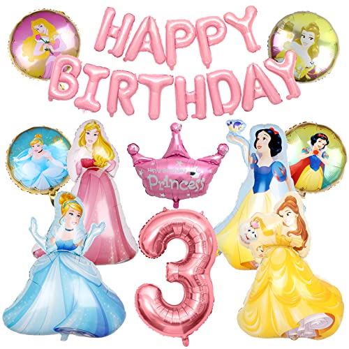 Principesse Palloncino,9 Pezzi Palloncini Foil Princess+Numero 3 Palloncini Principesse+Palloncino Banner Compleanno,Principesse Palloncino Foil Forniture per Bambini Feste di Compleanno