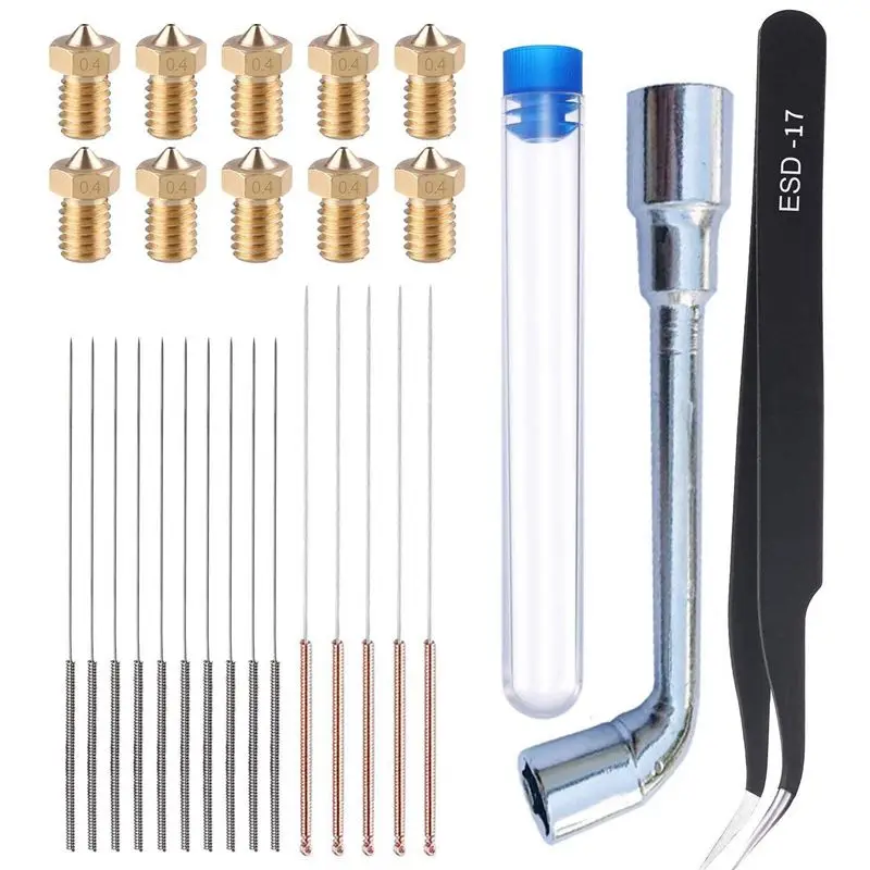 3D Printer M6 Brass Extruder Cleaning Kit 10pcs V6 V5 0.4mm Nozzles, 15Pcs Needles, 1pc Spanner & 1pc Tweezer for E3D Makerbot