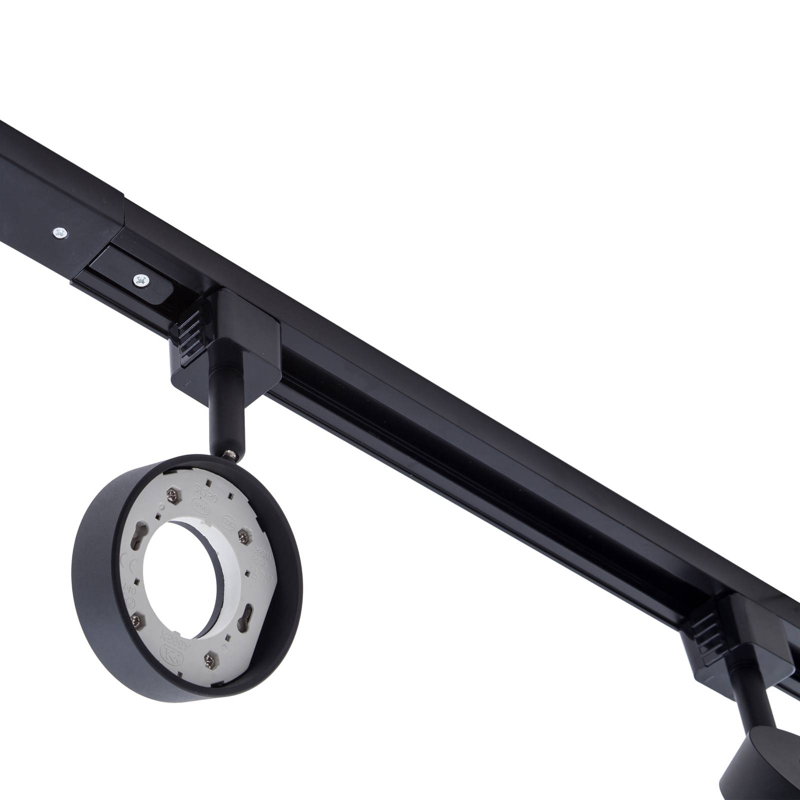 Sistema di binari neri a circuito singolo Jardani con faretti mobili Jardani è un moderno sistema di binari a circuito singolo ed è realizzato in alluminio. Ha una superficie nera ed è composto da tre faretti e un binario. I faretti possono essere dotati di sorgenti luminose GX53 e consentono una libera scelta del colore di luce, perfettamente adattabile alle esigenze personali. Inoltre, i faretti possono essere ruotati di 350° e inclinati di 90°, in modo da orientare il fascio di luce a seconda delle esigenze. Jardani è ideale per l'illuminazione di spazi commerciali.