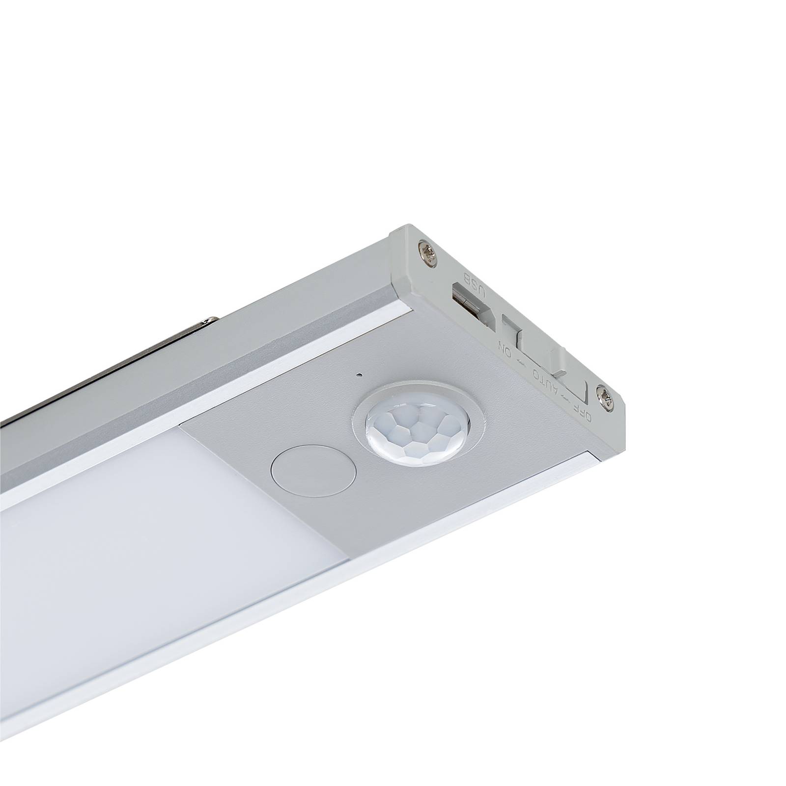 Lampada LED per mobili Saverio angolare in grigio argento, con sensore, interruttore e connessione USB Questa lampada LED per mobili, con i suoi LED di colore bianco caldo, funziona tramite connessione USB ed è adatta a molti scopi. Il sensore è un vantaggio e consente alla luce di accendersi automaticamente quando viene rilevato un movimento. Tuttavia, è anche possibile azionare la luce manualmente. Un pratico oggetto luminoso per illuminare una superficie di lavoro!