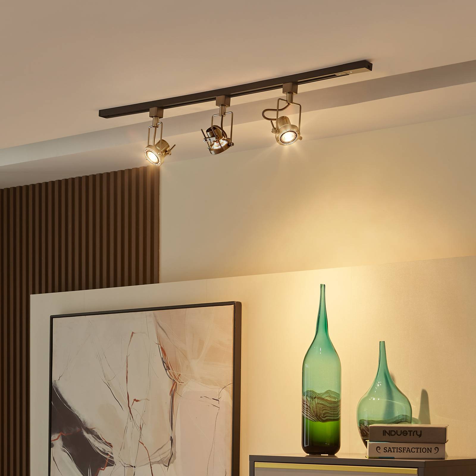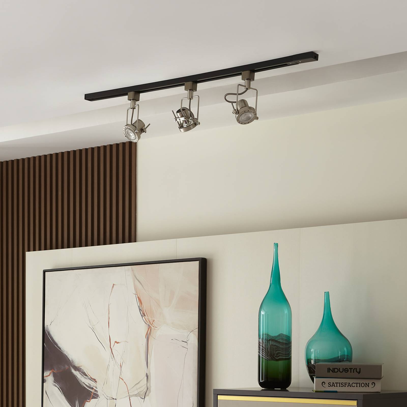 Sistema a binario Morganis a 1 circuito in nichel satinato, tre faretti dall'aspetto tecnicoMorganis può essere utilizzato sia in ambito privato che commerciale. I tre faretti, realizzati in metallo con finitura in nichel satinato, hanno un aspetto un po' tecnico e possono essere regolati a piacere e dotati di lampade a scelta. Sono disponibili, ad esempio, riflettori con diversi colori di luce o diverse angolazioni del fascio luminoso, per creare il quadro luminoso della propria casa o del proprio negozio nel modo più personalizzato possibile e adattato alle condizioni del luogo. Si tratta di un sistema completo pronto all'uso con binario nero monofase, dotato di tappo terminale e alimentazione.