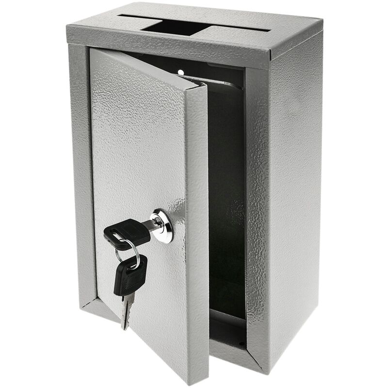 Cassetta delle lettere robusta con doppia apertura nella parte superiore in cui depositare chiavi, denaro, buste o altre donazioni e progettata per essere installata a parete. Caratteristiche del prodotto: DATI TECNICI: Cassetta delle lettere in metallo grigio con funzioni di restituzione delle chiavi o per depositare donazioni di ogni genere che presenta nella parte superiore una doppia apertura a fessura e un sistema di protezione delle chiavi per evitare la rimozione indesiderata degli oggetti che si trovano all'interno della cassetta (vengono fornite due chiavi di sicurezza) . DESIGN: L'intero prodotto è realizzato in metallo grigio e si distingue per la doppia fessura nella parte superiore, con una parte più ampia e una più lunga. Inoltre, la porta d'ingresso ha un sistema di apertura a chiave (sono fornite due chiavi di sicurezza). SLOT: L'urna ha due diversi slot. Il primo è allungato per poter inserire buste o simili e misura 107 x 5 mm. Al contrario, l'altra urna è quadrata