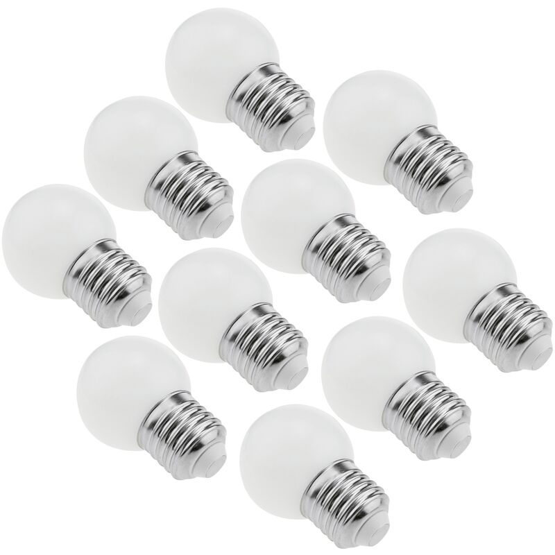 Lampadina LED dal design sferico per creare atmosfera all'interno e all'esterno. La sua tecnologia LED consente di risparmiare energia elettrica senza perdere la qualità della luce. Ideale per uso decorativo alle feste e per ghirlande all'aperto. Caratteristiche del prodotto: CARATTERISTICHE: la lampadina a LED fornisce una luce brillante e di lunga durata risparmiando energia. Dimensioni ridotte di facile installazione grazie alla filettatura E27. Il suo design è ideale per decorazioni in ristoranti, bar, caffè, giardini, ecc. Include 10 unità. SPECIFICHE: Lampadina LED piccola a basso consumo. Ha una forma sferica G45, colore bianco caldo e temperatura 3000K. Efficiente adattamento al connettore grazie alla spessa coppa della filettatura E27. Ha una tensione massima di 230 VAC. La sua classe energetica è F. La potenza massima è di 1,5 W e genera 130 lumen. Elevata durata con una vita utile di 25.000 ore. INSTALLAZIONE: Grazie alla filettatura E27, la più comune sul mercato
