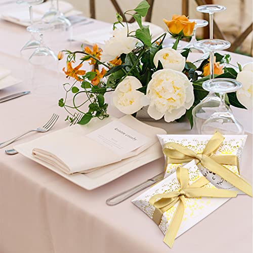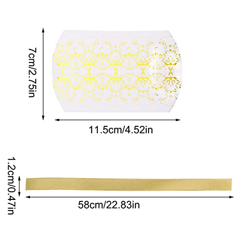 【Lista di Imballaggio】scatole confetti comprese scatole di cuscini per caramelle da 50 pezzi e nastri dorati da 50 pezzi. Queste scatole regalo per cuscini arriveranno in confezione piatta, si impilano e si conservano in modo salvaspazio, basta aprire un'estremità e inserire i dolcetti all'interno.