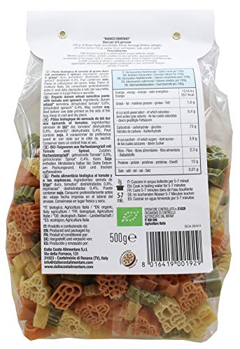 La pasta colorata di semola di grano duro, pomodori e spinaci è disponibile nel formato da 500g