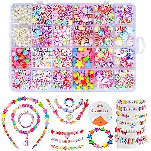 Probuk Perline Fai da Te per Bambini Set 450+pcs 24 Scomparti Colorate Bambini Fare Gioielli Kit con 10m Filo Elastico Set di Artigianato pour Braccialetti,Collane,Regali per la Festa dei Bambini
