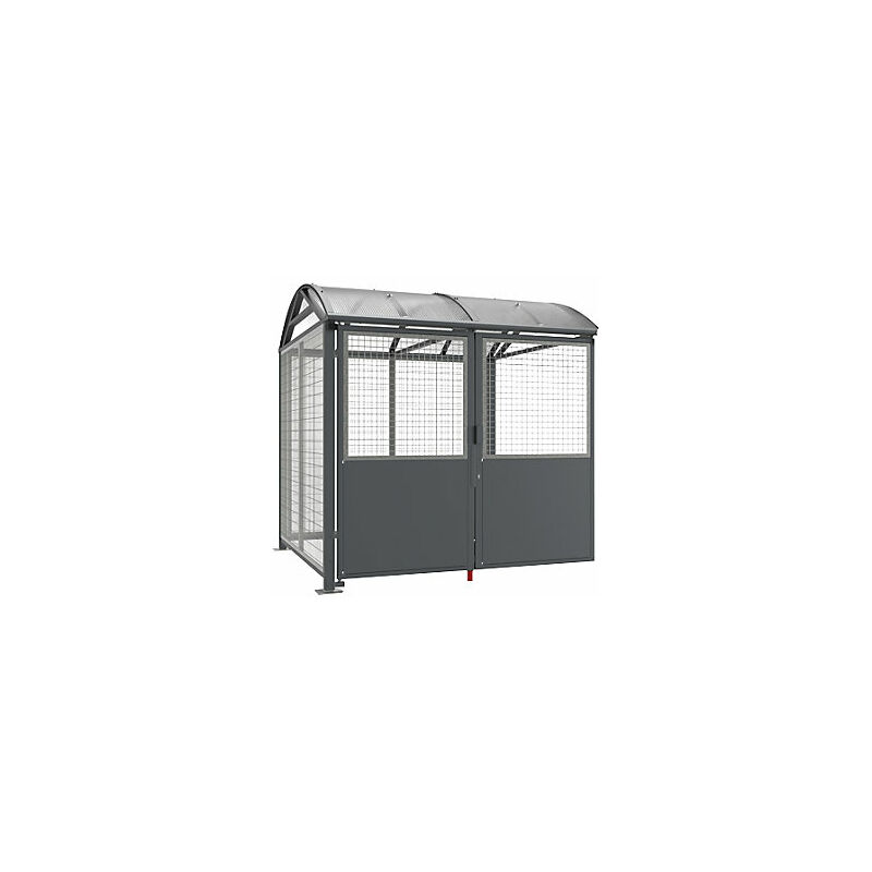 Tettoia per biciclette, con serratura, ampliamento con serratura a cilindro, grigio antracite. Fornitura = smontato. Altezza = 2646 mm. Larghezza = 2520 mm. Profondità = 2834 mm. Superficie = zincatura a fuoco. Materiale cornice/telaio = acciaio, zincato a fuoco. Colore cornice = grigio antracite. Struttura = unità aggiuntiva. Materiale pareti laterali = griglia d'acciaio. Tipo di prodotto = tettoie. Parcheggio sicuro per biciclette, scooter e motociclette. In acciaio. PROCITY® ti offre un riparo per il parcheggio sicuro di biciclette, scooter e motociclette. I robusti montanti in acciaio e la griglia in acciaio zincato a fuoco rendono questo prodotto una soluzione efficace e duratura per ridurre il rischio di furto dei veicoli a due ruote. Rivestimento delle pareti laterali e posteriori: griglia di acciaio Ø 5 mm, saldata al telaio in acciaio. Porta doppia: parte superiore in griglia di acciaio Ø 5 mm, parte inferiore in lamiera d'acciaio, spessore 1,5 mm. Apertura dall'interno