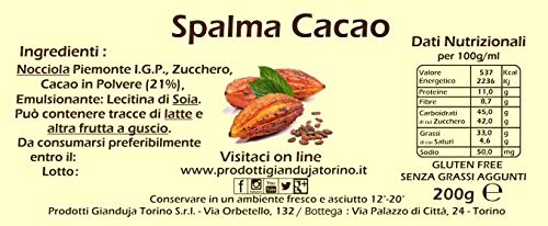 Ingredienti: Nocciole Piemonte IGP, Zucchero, Cacao in polvere (21%), Emulsionante: Lecitina di Soia