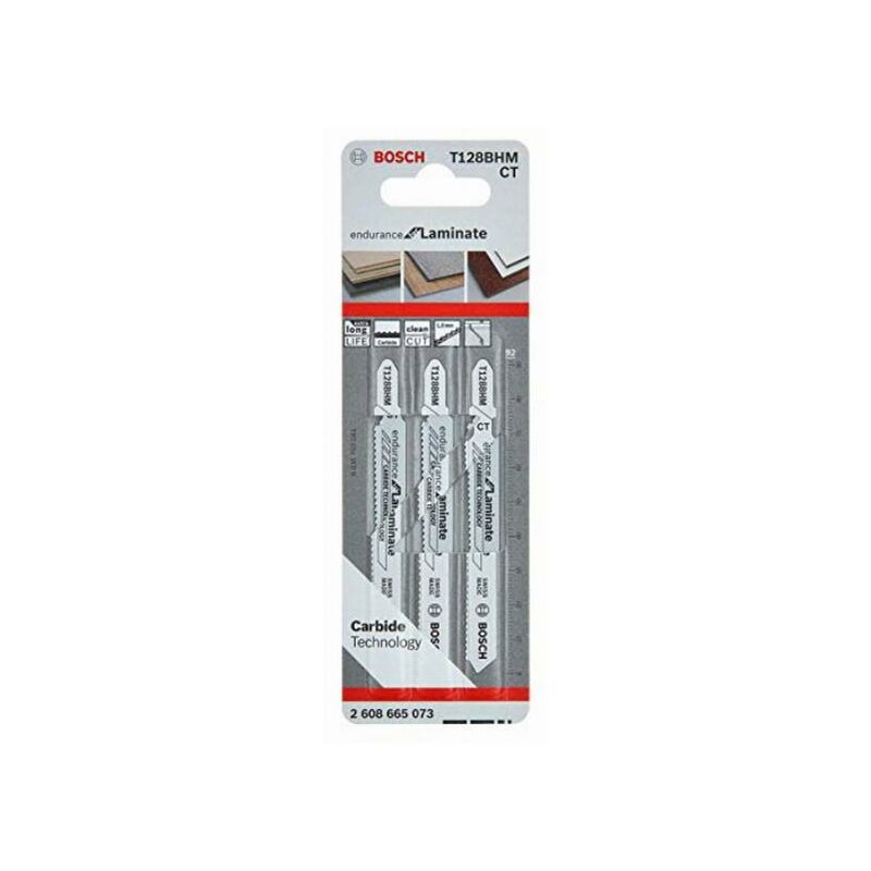 Ideale per impieghi impegnativi su materiali resistenti Le lame per seghetto alternativo standard in bimetallo cedono facilmente in presenza di materiali resistenti, quindi finora era necessario un numero elevato di lame per seghetto alternativo per portare a termine il lavoro. Grazie alle lame per seghetto alternativo Bosch Professional T 128 BHM Endurance for Laminate, non sarà più un problema eseguire il taglio di materiali resistenti quali pavimentazione in laminato, vinile e Trespa® con rinforzo di fibre. La Carbide Technology di Bosch rende le lame per seghetto alternativo particolarmente resistenti al calore, il che contribuisce a raggiungere una durata fino a 40 volte superiore rispetto alle lame standard in bimetallo. Le lame si adattano a seghetti alternativi di tutti i comuni produttori che presentano il codolo a T (attacco con dente di arresto). Dotazione di fornitura: 3 pz. lame per seghetto alternativo Bosch Professional T 128 BHM Endurance for Laminate - Lunghezza 92