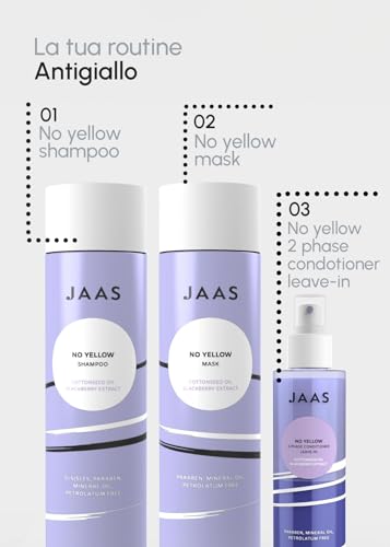 CONDITIONER ANTIGIALLO: Spray condizionante bifasico ad alto potere nutritivo. Ideale per capelli biondi, decolorati, con mèches o grigi. Condiziona i capelli senza appesantirli. Contrasta e neutralizza riflessature oro indesiderate. Riporta la tua chioma alla sua purezza originale, con la Maschera della linea NO Yellow di JAAS.