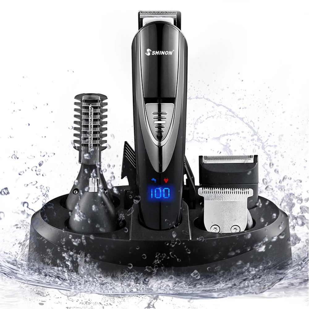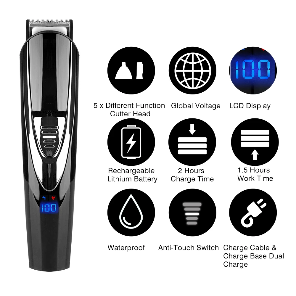 Professional Waterproof 5 In 1 Men Hair Trimmer LCD Display Electric Hair Clipper Dual Charging Hair Cutter Machine+Charge Base
