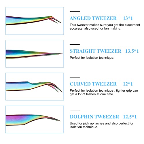 Contenuto della confezione: 4 pinzette arcobaleno in acciaio inossidabile, contiene pinzette dritte, pinzette curve, pinzette angolate e pinzette delfino. Bella custodia per proteggere e riporre le pinzette.