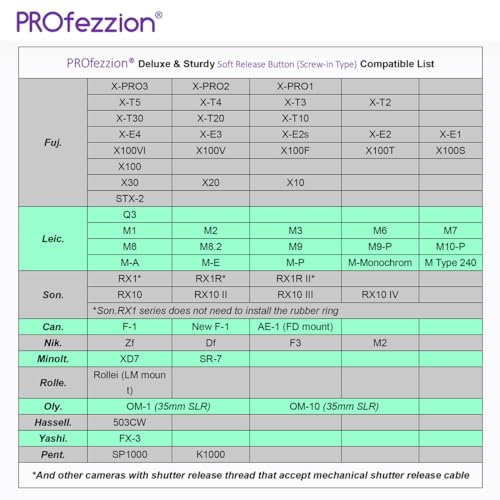 Compatibilità: Fujifilm X-PRO1, X-PRO2, X-PRO3, X-T2, X-T3, X-T4, X-T10, X-T20, X-T30, X-E1, X-E2, X-E2s,X-E3,X100,X100S, X100T, X100F, X100V, X100VI, X10, X20, X30, STX-2 // Leica Q3, M1, M2, M3, M6, M7, M8, M8.2,M9, M9-P, M10-P, M-A, M-E, M-P, M-Monochrom, M Type 240 // Sony RX1, RX1 R, RX1 RII, RX10, RX10 II, RX10 III, RX10IV // Canon F-1, AE-1 (FD mount) // Nikon Df, F3, M2 // Minolta XD7, SR-7 // Rollei (LM mount) // Olympus OM-1, OM-10 // Pentax SP1000, K1000// Hassellad 503CW // Yashica FX3 etc.