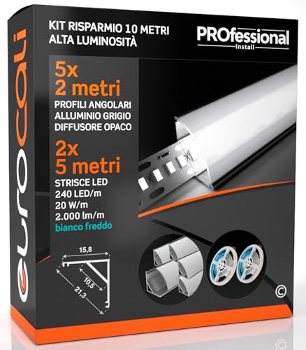 5 Profili Angolari da 2 metri (10mt) in Alluminio + 10mt Striscia LED 12V 240 LED/mt 20W/m 2000 lumen - Luce Bianco Freddo 6500K