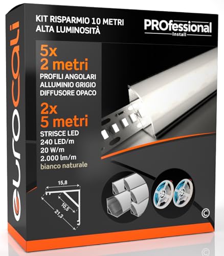 5 Profili Angolari da 2 metri (10mt) in Alluminio + 10mt Striscia LED 12V 240 LED/mt 20W/m 2000 lumen - Bianco Naturale 4000K