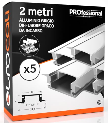 5x Profili da 2 metri (10mt) in Alluminio grigio per Strisce LED Copertura Opaca - larghezza max striscia led 12.4mm - 24.7 x 7