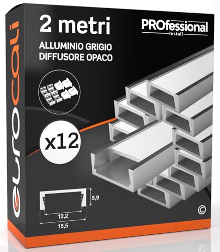 12 Profili da 2 metri (24mt) in Alluminio grigio per Strisce LED Schermatura Opaca - Larghezza Massima Striscia LED 12.2mm - 15.5 x 5.9