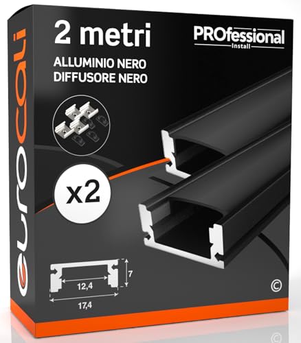 2 Profili da 2 metri (4mt) in Alluminio Nero per Strisce LED Copertura Opaca - larghezza max striscia led 12,4 mm - 17,4 x 7