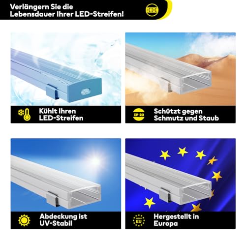 Vantaggi: grazie ai nostri profili per LED a marchio Alumino, le strisce LED sono a raffreddamento passivo, quindi hanno una durata maggiore. Grazie alla copertura la luce si lascia distribuire uniformemente.