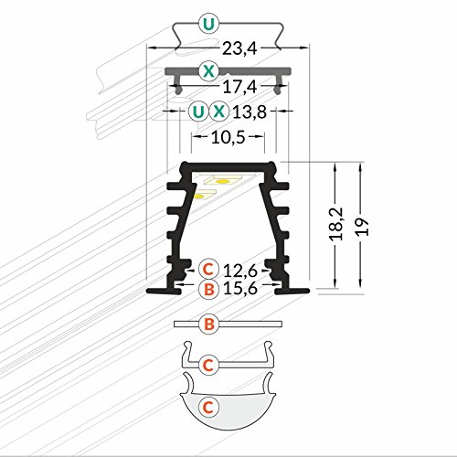 Contenuto della confezione: 1 profilo, 1 copertura, 2 terminali, 2-4 staffe per profilo a seconda della lunghezza del profilo (2-4 ganci di montaggio).