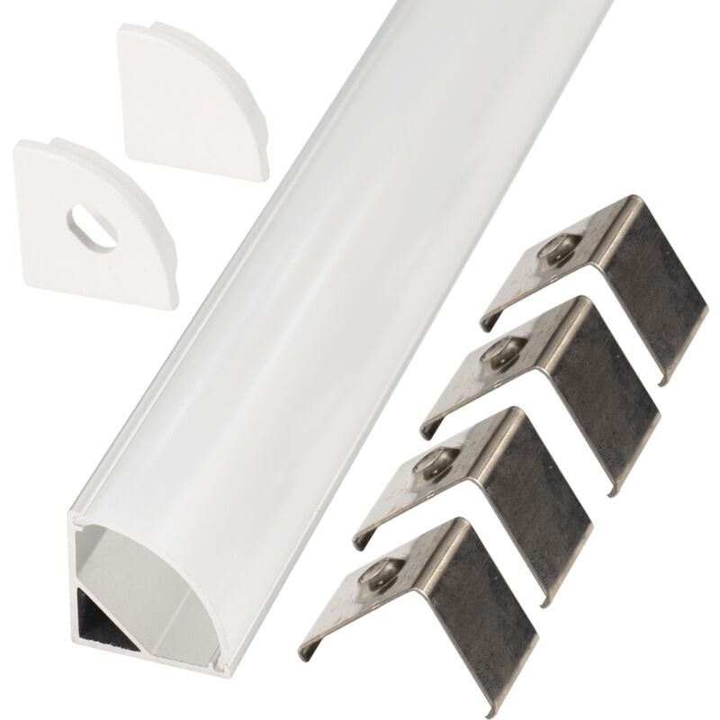 Barra di profili LED in alluminio anodizzato 16 mm. x 16 mm. ad angolo con diffusore curvo da installare con una striscia LED all'interno. 1. Fornito in barre da 2 m. 2. Due coperture per barra. 3. Quattro clip per barra. 4. Diffusore opalino da 2 m. -Informazioni sulla confezione: Include 100 barre (200 m.) Peso: 22 kg. Dimensioni: 204 x 18 x 11 cm. (FS02 ZK01)