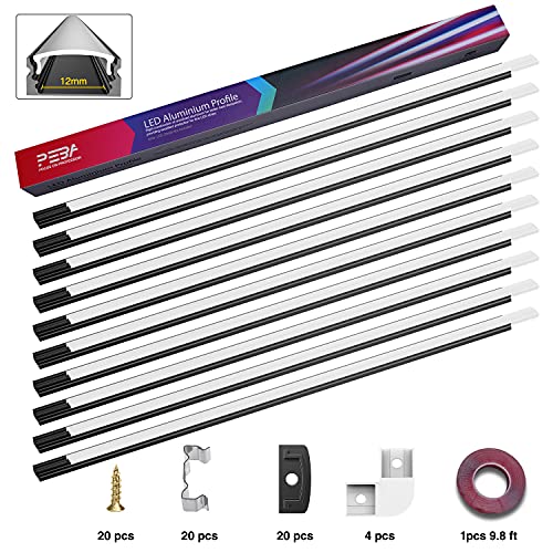 Profilo LED per Strisce LED (1-12 mm),profilo in Alluminio Nero + Copertura U-Forma 10 x 1 m, Profilo in Alluminio con Connettore Angolare, Nastro Adesivo, Tappi Terminali, Clip di Fissaggio PEBA