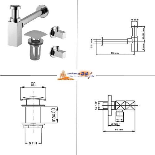 Profizeug24 Sifon Sifone con 2 valvole d' angolo rettangolare e pop up Click Clack