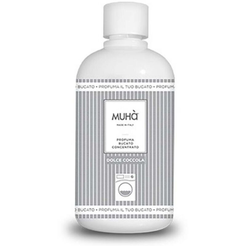 Profuma il tuo bucato con Muhà Dolce Coccola dalla fragranza dolce e vanigliata con noce di cocco e arancio, un cuore ancora più dolce di latte e caramello unito a essenze aromatiche del legno di guaiaco Ideale per bucato a mano e in lavatrice, con profumazione persistente anche con l'utilizzo dell'asciugatrice Riduce e previene la formazione di cattivi odori sul bucato, anche quelli di umido Capacità: 400 ml