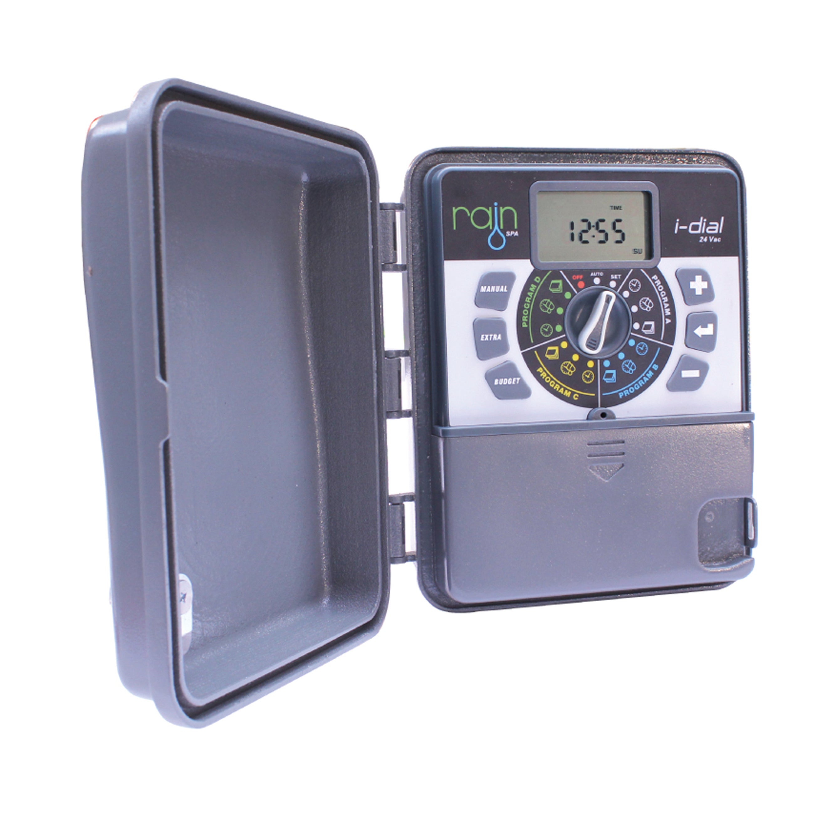 CARATTERISTICHE TECNICHE 6 stazioni - Trasformatore interno (nella versione 24 VAC) - Schermo retroilluminato - Uscita comando pompa e Master Valve (nella versione 24 VAC) - Uscita sensore pioggia CARATTERISTICHE PROGRAMMAZIONE 4 programmi indipendenti - 1 partenza per ogni programma - Visualizzazione della prossima irrigazione - Tempi di irrigazione da 1 min. a 240 min per stazione - Programma d'irrigazione per giorni settimanali o per intervalli da 1 giorno a 19 giorni - Regolazione stagionale da 10% a 200% - Funzione PUMP START che permette l'attivazione della pompa per settore (nella versione 24 VAC) - Funzione SENS START che permette l'attivazione del sensore per settore - Funzione OFF - Segnalazione batterie scariche - Memoria non volatile. Ideale per irrigare giardini di media dimensioni con irrigatori a scomparsa e alagocciolante. Può essere installata all'esterno della casa. Può gestire fino a 6 elettrovalvole a 24 VAC (modello standard per gli impianti irrigazione di giardini) riconoscibili da due cavi dello stesso colore. Compatibile con tutte le elettrovalvole 24 Vac presenti sul mercato dell'irrigazione.. Schermo retroilluminato per un'ottima visibilità in condizioni di bassa illuminazione. Ingresso sensore pioggia programmabile per elettrovalvoloa