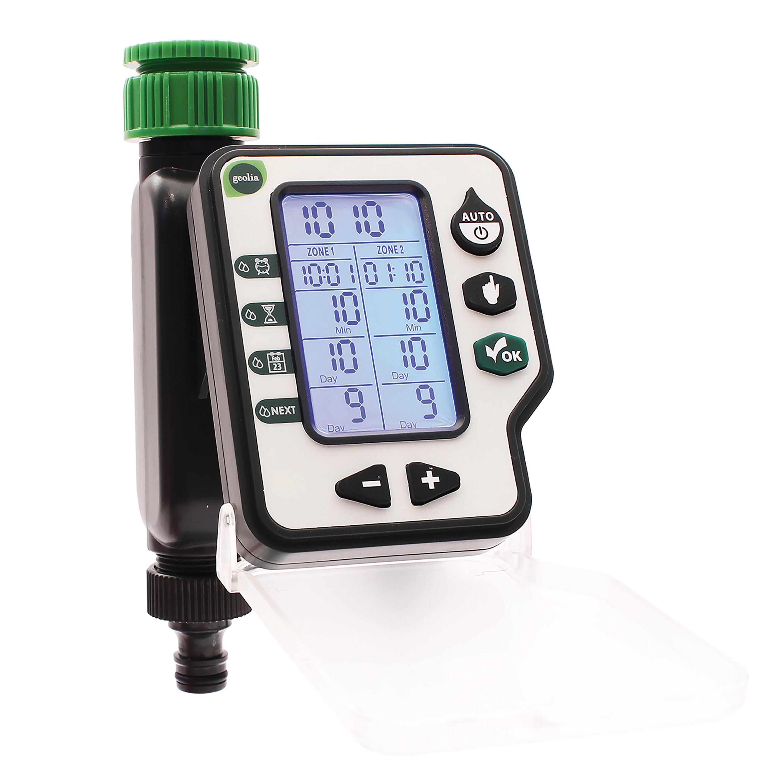 CARATTERISTICHE TECNICHE Numero settori 2 - Attacco 3/4"-1" - Uscita 3/4"M - Alimentata con 2 batterie alkaline 1.5 volt (AA) - Materiale di fabbicazione ABS - Coperchio di chiusura - Parte elettronica estraibile - Alloggiamento batterie con OR di tenuta - Schermo retroilluminato - Valvola a membrana - Pressione di utilizzo: min 1.0 max 6.0 bar - Portata massima min. 5 l/min max 40 l/min CARATTERISTICHE PROGRAMMAZIONE Numero programmi 1 - Tempi di irrigazione da 1 min a 240 min - Indicazione dell'ora di partenza - Indicazione prossima irrigazione - Massimo 4 partenze giornaliere - Minimo 1 partenza ogni 15 giorni - Segnalazione batterie scariche - Visualizzazione tempo residuo di irrigazione. Ideale per l'irrigazione di balconi o terrazzi.. Può essere utilizzato per la micro irrigazione a goccia di vasi e piccoli orti. Puoi abbinarlo al KIT 30 VASI (codice articolo 82584788) o al KIT ALA GOCCIOLANTE 25 MQ (codice articolo 82584791). La facile programmazione permette di impostare in 3 semplici passaggi l'ora di partenza, la durata d'irrigazione e la frequenza dell'irrigazione. Il sensore pioggia (non fornito) consentirà di risparmiare acqua evitando d'irrigare durante la pioggia.